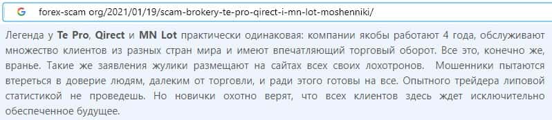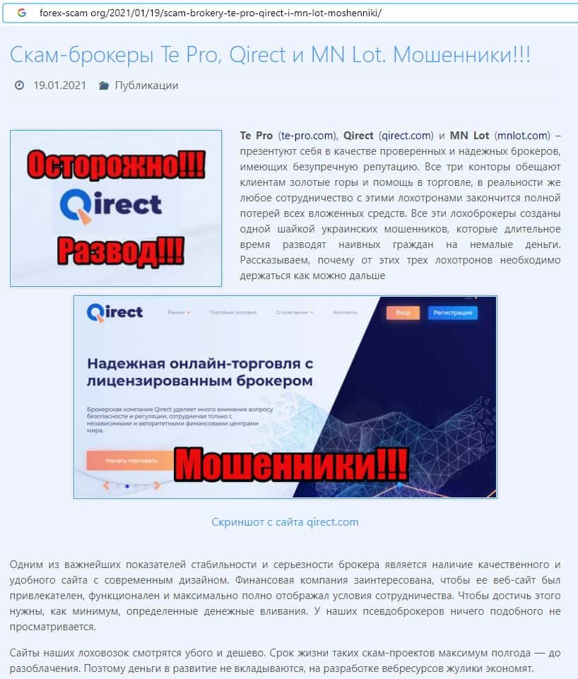 На онлайн-ресурсе форекс-скам орг была найдена информация о том, что жулики Кьюирект являются создателями таких лохотронов как MNLot и Те Про.