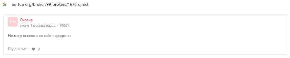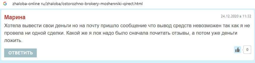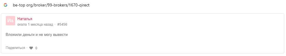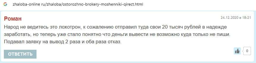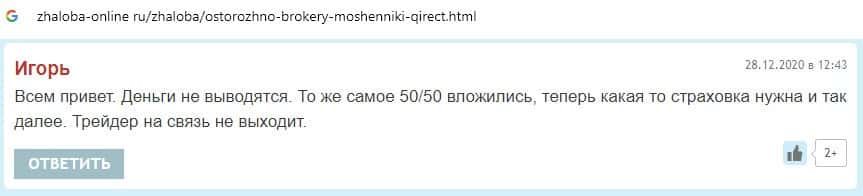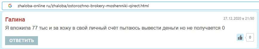 В данном разделе предоставлены пользовательские отзывы о том, что аферисты Qirect не выводят денежные средства своим клиентам, что является признаком кухни.
