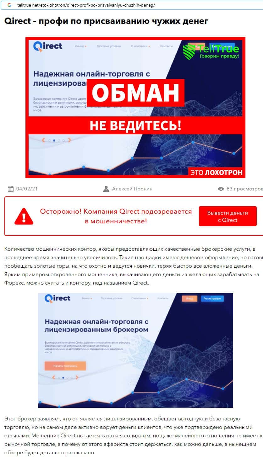 Обманщики Qirect присваивают чужие деньги себе, поэтому пользователи всемирной паутины перестали доверять данному псевдо-брокеру.