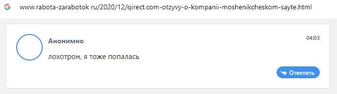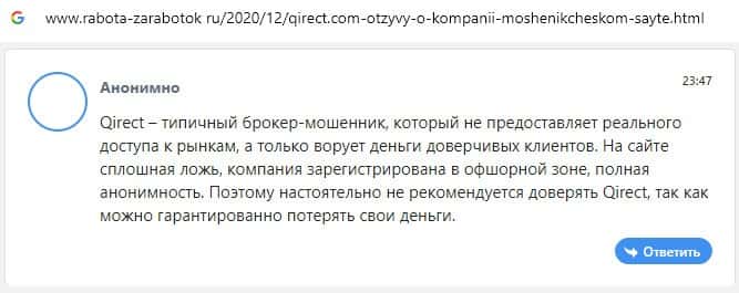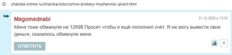 Интернет-лохотрон Кьюирект не вызывает доверия у пользователей, поскольку в сети есть множество негативных комментариев о данной псевдо-брокерской конторе.
