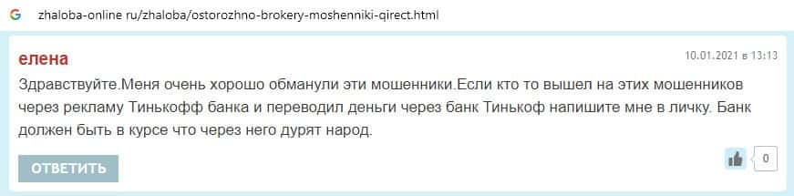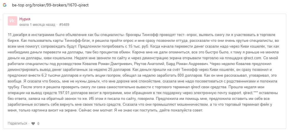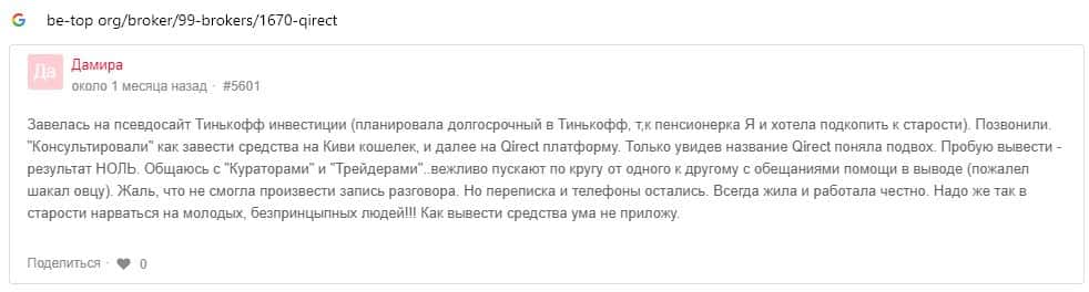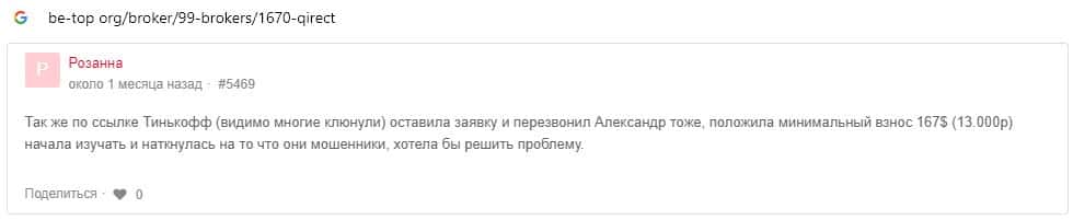 Далее предоставлен отзыв пользователя, который перешел по той же ссылке подумав, что шараге Qirect можно доверять, поскольку их ссылка находится на сайте Тинькофф Инвестиции.