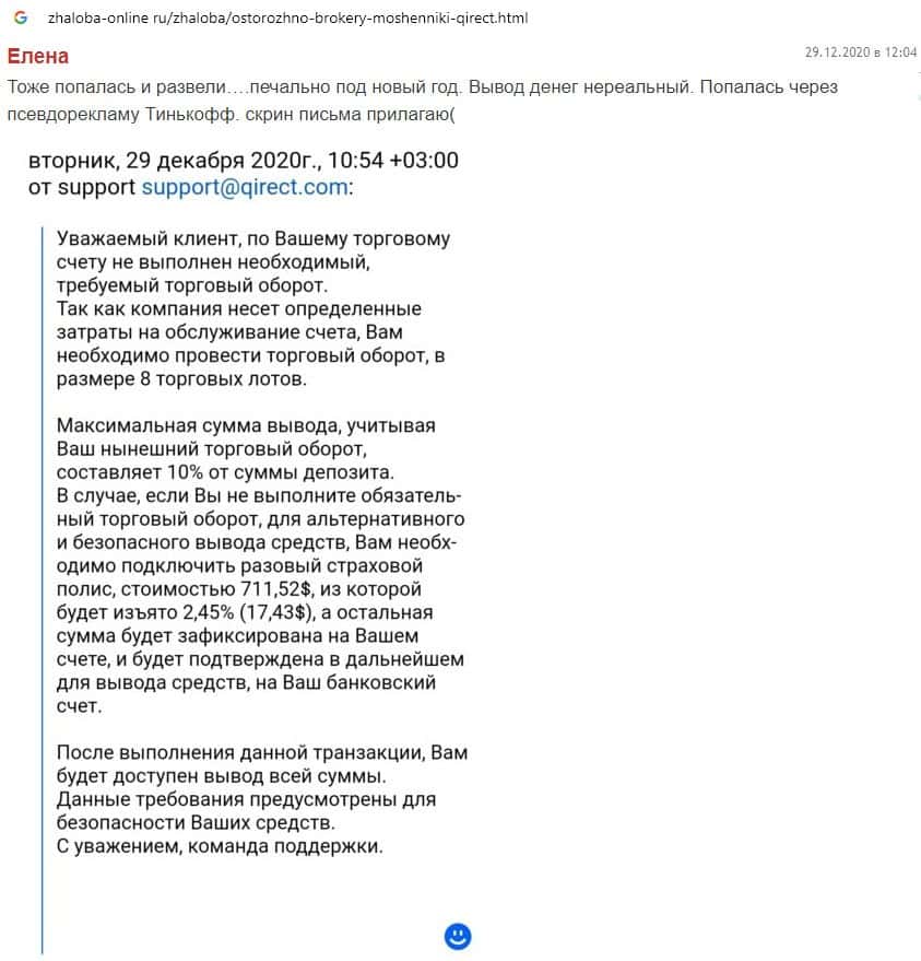Псевдо-брокерская организация Qirect выдумывает различные обстоятельства препятствующие возможности осуществления денежных выплат.
