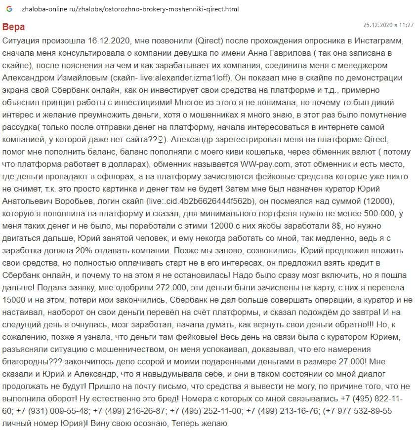 Пользователь потерял свои денежные средства на сайте псевдо-брокера Qirect, в своем отзыве указал номера телефона данной мошеннической организации.