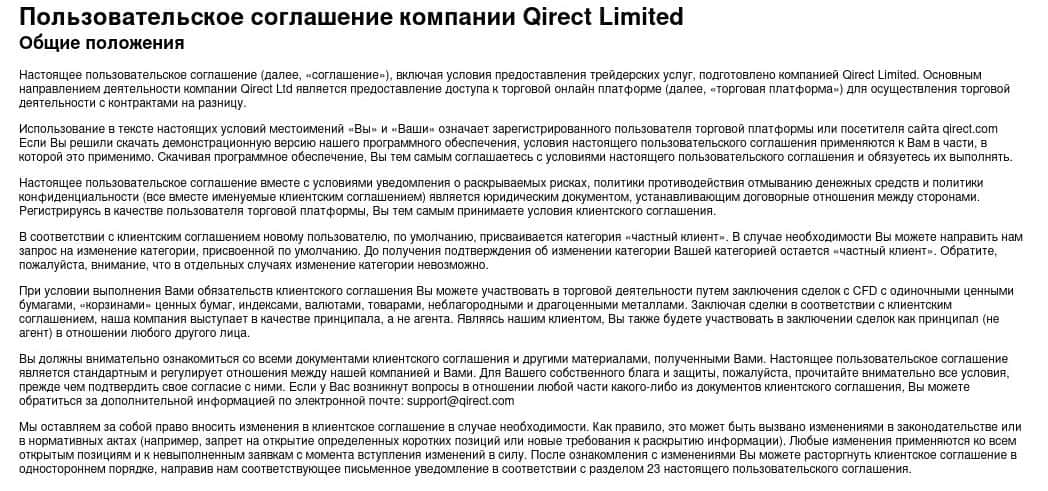 Ниже предоставлена полная версия клиентского соглашения мошеннической организации Qirect, которое подтверждает то, что перед нами очередная Форекс кухня.