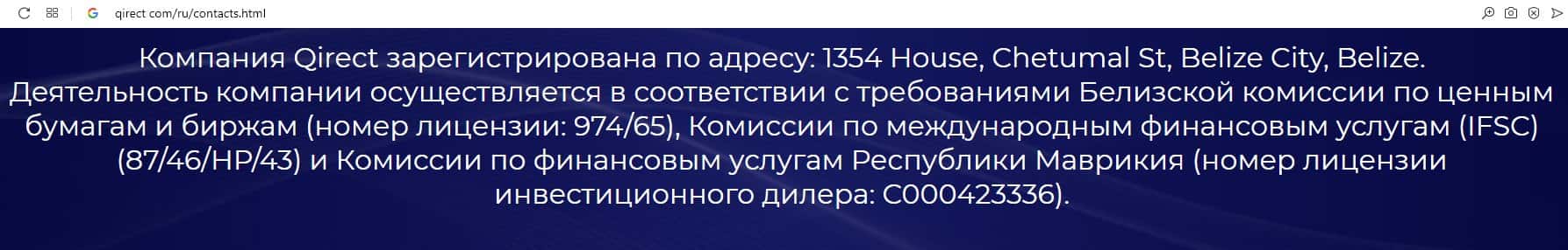 - Информация о лицензии скам-организации Qirect