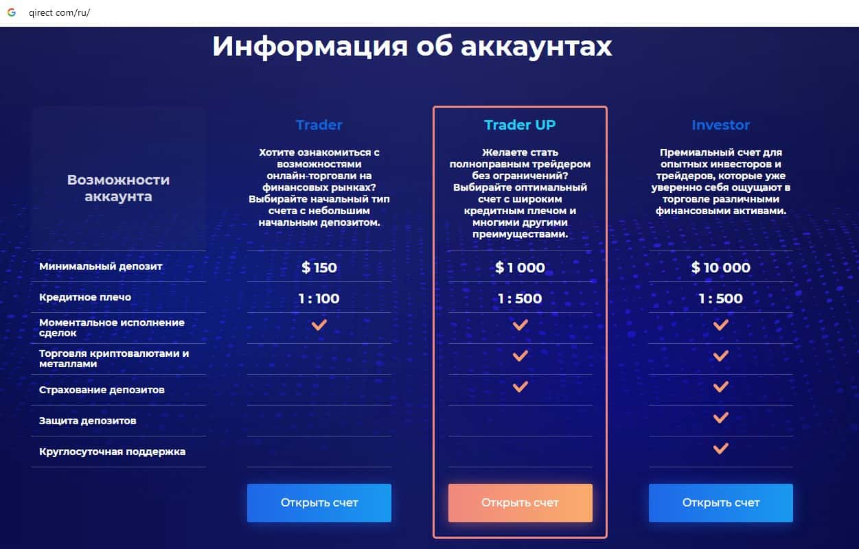Жулики Qirect предлагают клиентам на выбор 3 типа торгового счета: Trader, Trader UP, а также Investor. Реальный Форекс стартует в основном с суммы в 100000 долларов.
