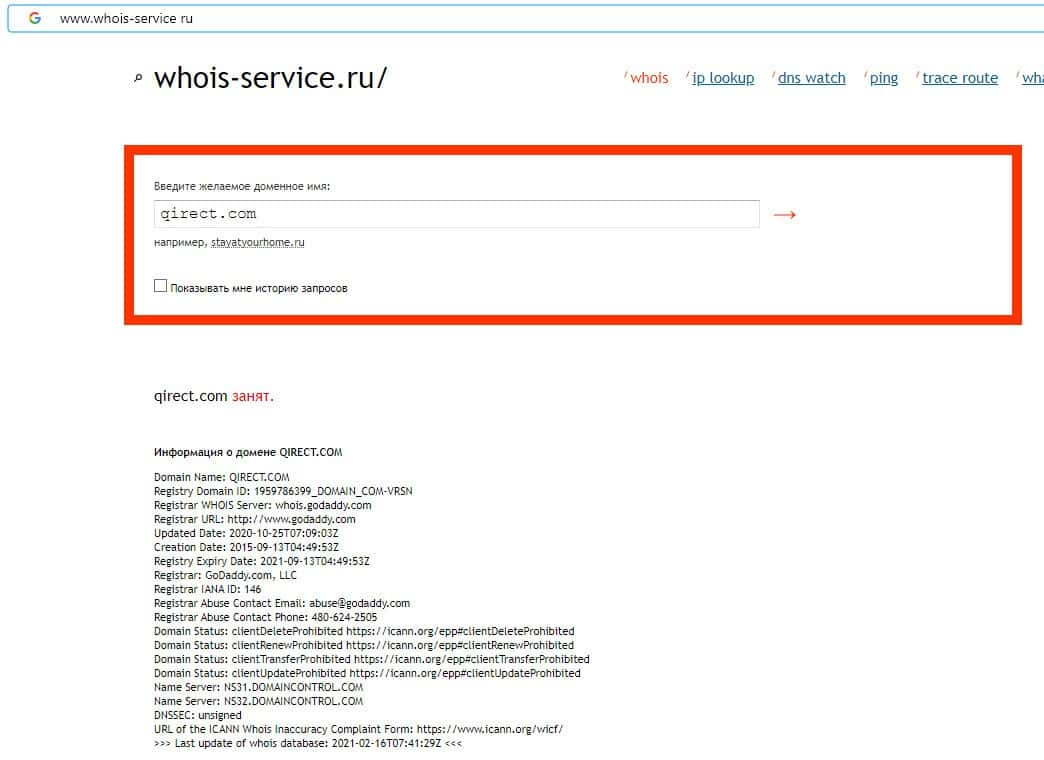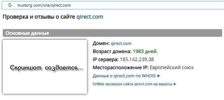 - Информация о возрасте домена скам-организации Qirect