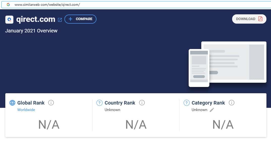 При проверке источников бренда по странам скам-компании Qirect на сайте similarweb com, информация отсутствует, что является признаком фейкового лохотрона.