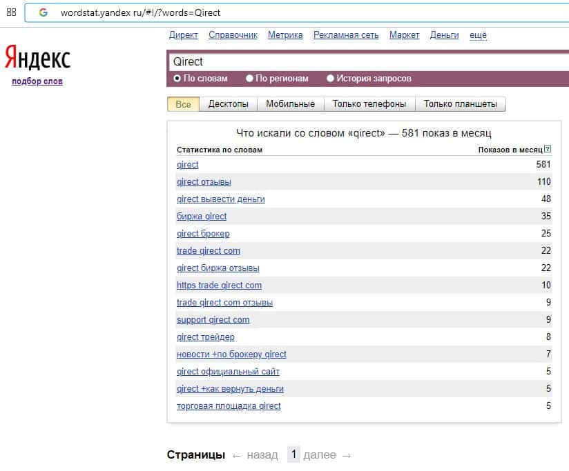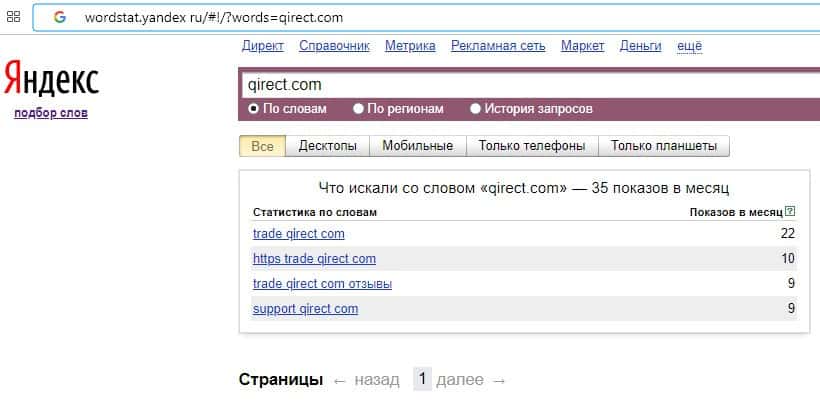 Количество брендовых запросов название домена компании "qirect.com" на Вордстарт Яндекс Ру составляет 35 запросов за месяц.