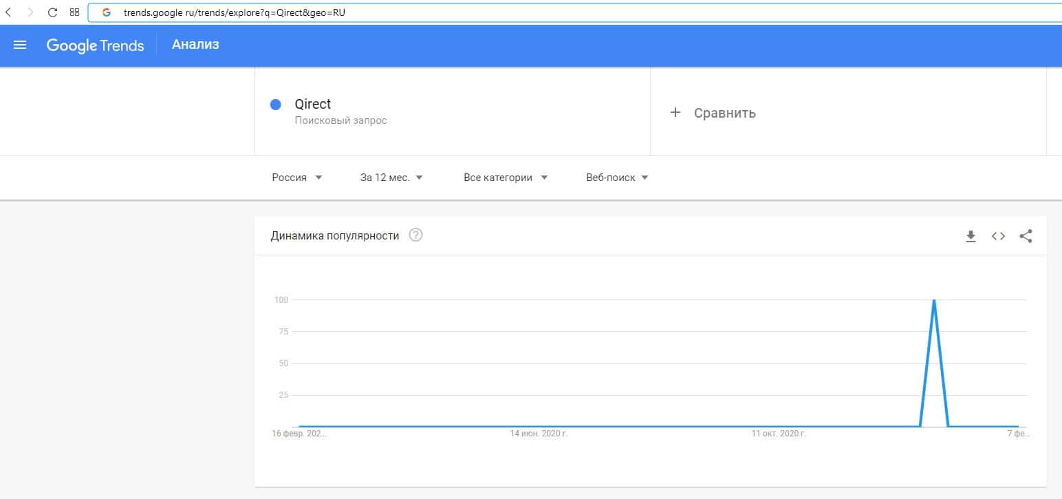 Динамика популярности по количеству брендовых запросов названия компании на английском языке "Qirect" на Трендс Гугл Ру отображена на графике ниже.