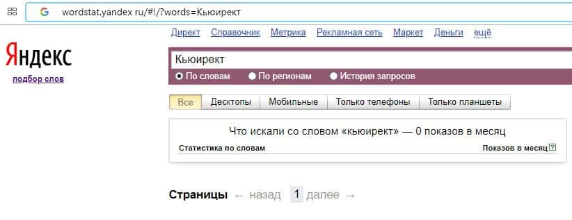 Количество запросов по бренду названия компании на русском языке "Кьюирект" на wordstat yandex ru вероятно равно нулю.
