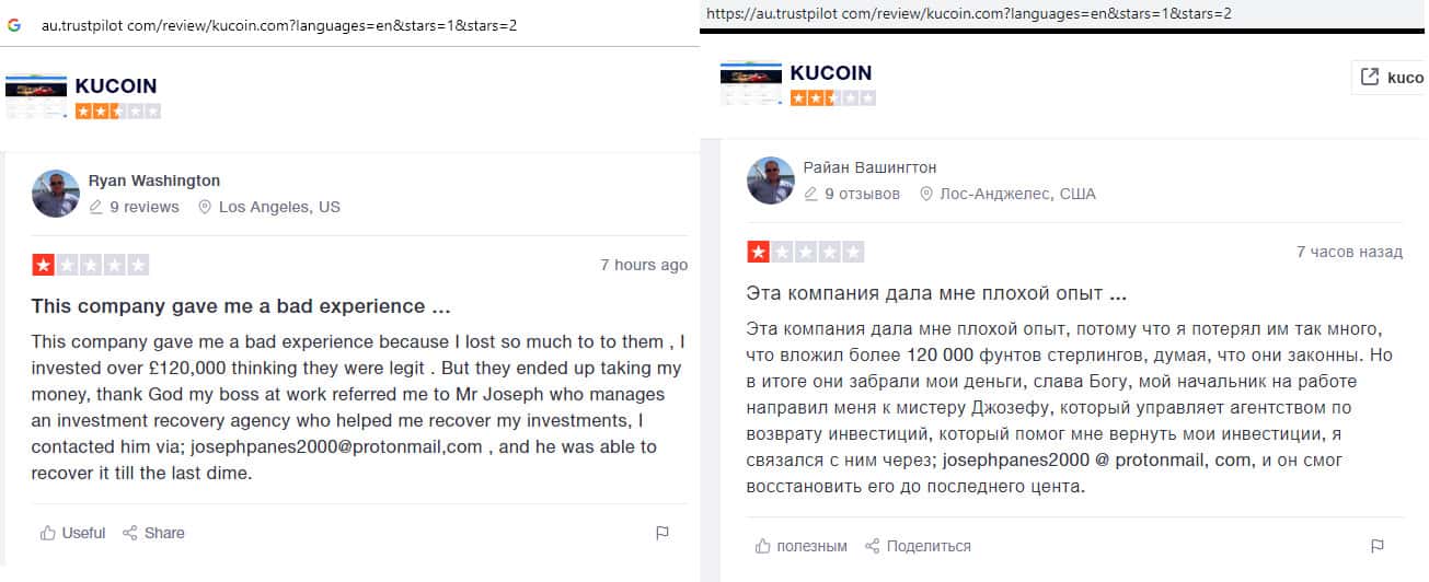 В еще одном отзыве рассказывается, как аферисты брокерской конторы KuCoin занимается откровенным разводом, при чем говорят одно, а на деле получается совсем иная ситуация и условия. Человек лишился навсегда 120 000 фунтов стерлингов, которые жулики присвоили себе. Как теперь вернуть украденное он понятия не имеет.