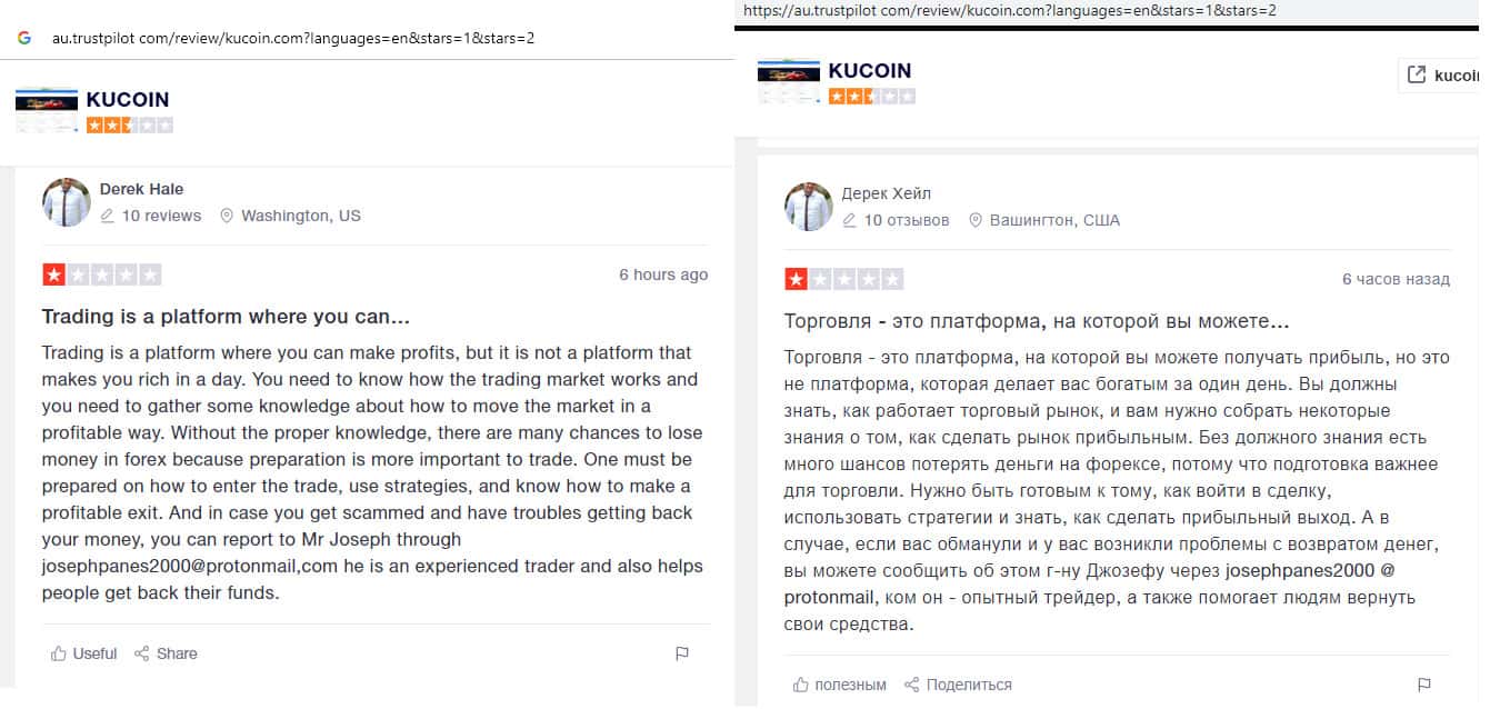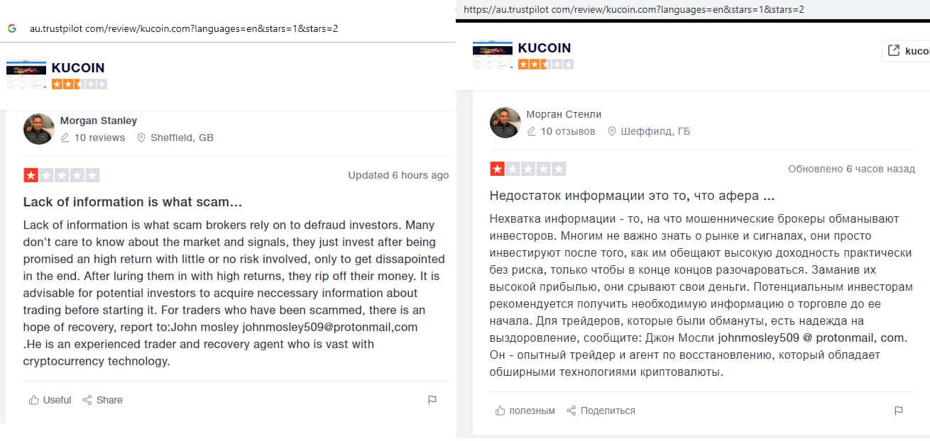 Далее представлен отзыв, от одного пользователя сети, о деятельности форекс-лохотрона KuCoin. Аферисты славятся нечестным поведением по отношению к своим клиентам и соответственно это сказывается на их репутации. В интернете уже достаточно доказательств, что веб-контора Кюкоин кидает людей.