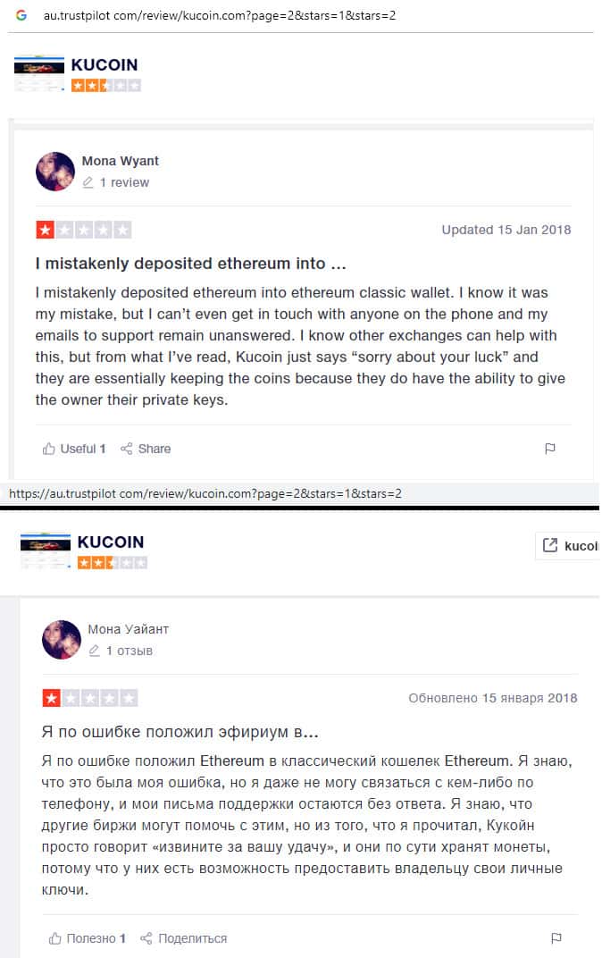 Девушка рассказала, как она по своей ошибке положила немного не в тот кошелек Эфир, при чем оба счета были открыты на бирже KuCoin. Естественно деньги не были зачислены, а вот в службе поддержки поступили по хамски. Они не отвечают на ее звонки и письма, а просто игнорируют ее и не хотят ни в чем разбираться.