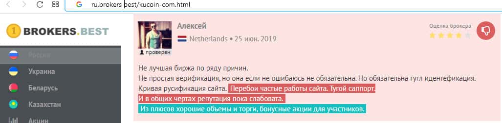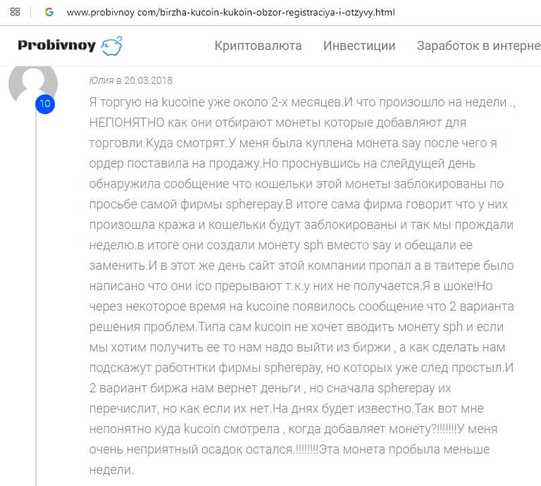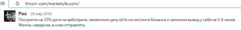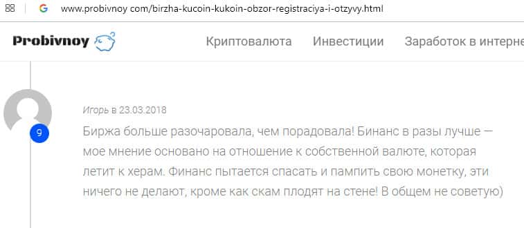 В следующем отзыве пользователь сети высказал такое нейтральное мнение о кухне KuCoin, так как считает, что глупо относиться к этому лохотрону как к лучшей криптовалютной бирже. У них очень часто сайт работает с перебоями, а также в общих чертах функционал и исполнение ордеров выглядит довольно слабоватыми.