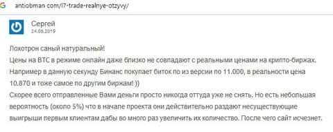 В данном отзыве человек разобрался в мнении, касательно конторы L7 Trade и оказалось, что цены биткоина в режиме онлайн даже близко не совпадают с реальными значениями на криптовалютных биржах. Так что все эти сказки о боте, который зарабатывает на этом деньги, вовсе не имеют никакой схожести с действительностью.