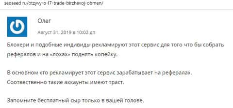 В следующем отзыве человек заметил, что некоторые блогеры позаписывали себе видео с обзорами работы конторы L7 Trade, якобы они там зарабатывают и всем советуют. Но подобная вещь нужна для того, чтобы как можно больше получить рефералов по партнерской программе и заработать денег на лохах.