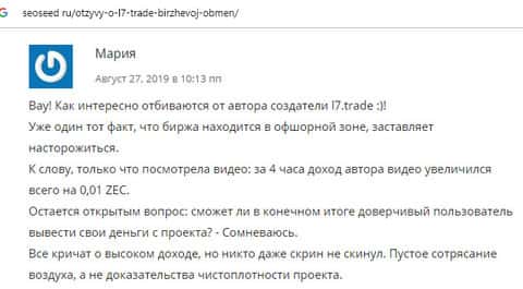 По мнению сайта-обзорника, который специализируется на конторах, подобных жуликам L7 Trade, данный лохотрон не имеет подтверждения взаимодействия с крупными криптовалютными биржами. Как только они поступят, то можно подтвердить надежность компании. Но пока это только миф, в который хочется верить, но в тоже время опасно.