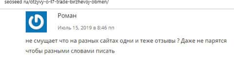 Один интернет-пользователь заметил, что мошенники конторы Л7 Трейд настолько примитивно мыслят, что даже не удосужились изменить текст отзывов, за размещение которых они заплатили своим пособникам с фриланса, либо это сделали сотрудники. В любом случае мошенники не блещут умом.