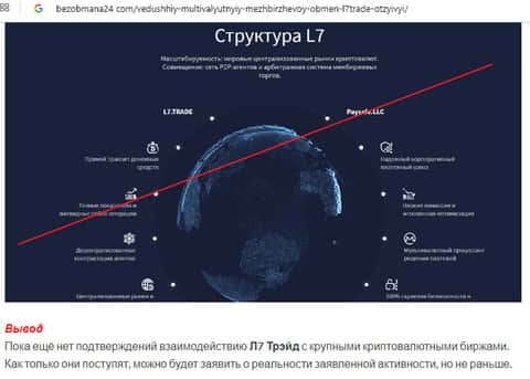 Далее представлен вывод одного интернет-портала, который провел исследование о конторе L7 Trade. В нем сказано, что проект вовсе не является мультивалютным межбиржевым обменом, так как это просто обычный хайп, который заточен на выкачивание денег из карманов неопытных интернет-пользователей.