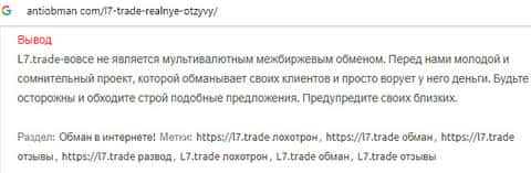 - Мошенники L7 Trade на разных сайтах публикуют одни и те же отзывы