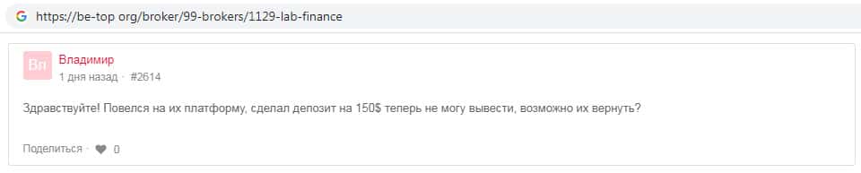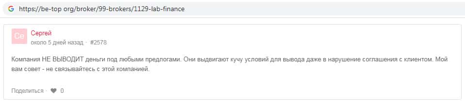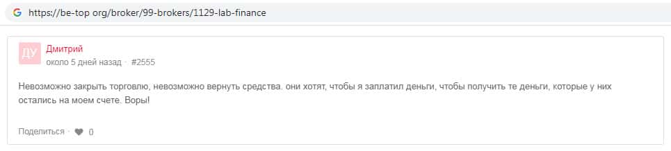 - Отзывы о скам-организации Лаб Финанс, ныне присутствующие в сети-интернет
