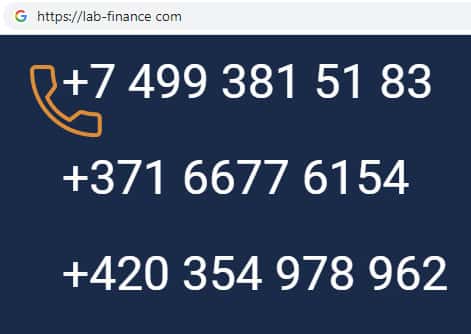 Мошенники Lab Finance на своем дырявом сайте указали несколько номеров контактного телефона, с которых навязчиво названивают потенциальным жертвам: