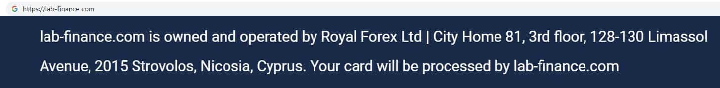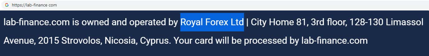 Юридическое лицо Royal Forex Ltd владеет мошенническим сервисом lab-finance com, компании Лаб Финанс, у которой оффшорная Кипрская регуляция.