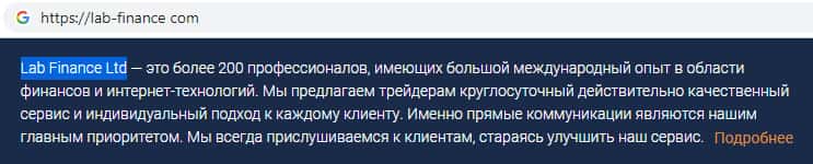 По запросам в поисковой системе Google, название бренда в виде домена с точкой"lab-finance.com" нет никакой информации.