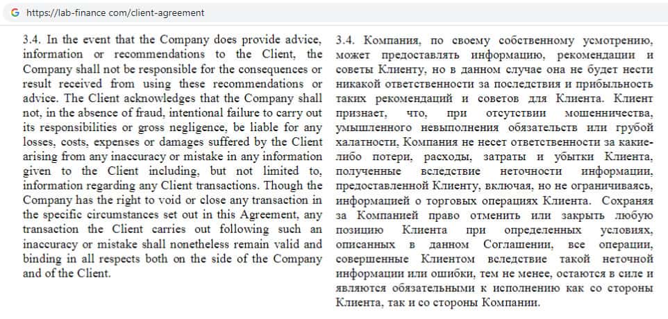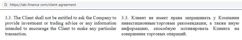Скам-организация Lab Finance не несет никакой ответственности за последствия тех рекомендаций, которые они дают клиенту в процессе торговли.