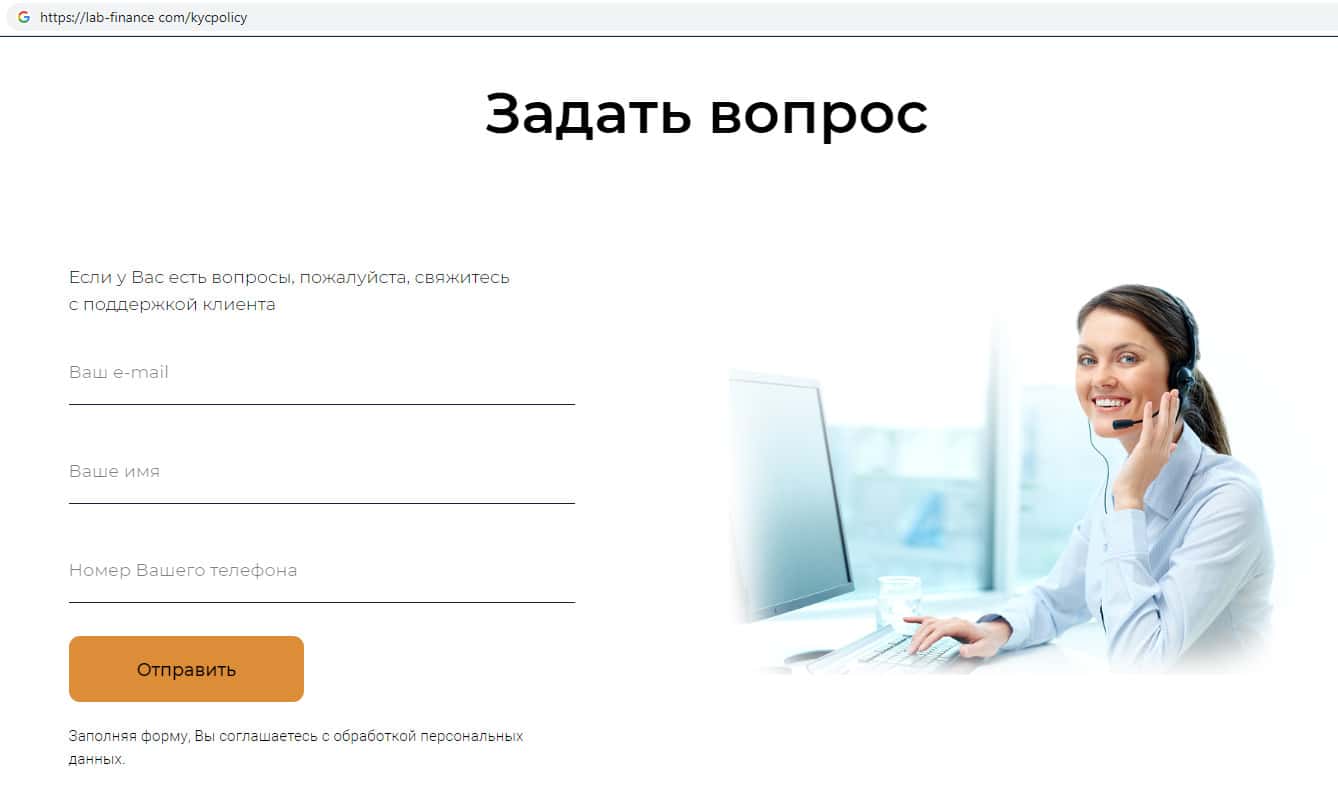 Жулики Лаб Финанс предлагают пользователям заполнить бланк обратной связи, где просят указать свое имя, адрес электронной почты и номер контактного телефона.