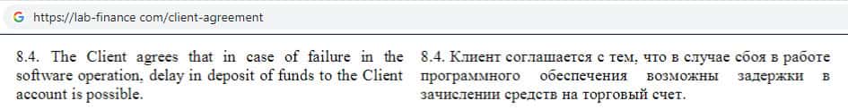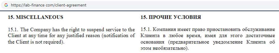 Скам-контора Lab Finance так же может прекратить обслуживание клиента в любое время без предварительного уведомления и без особых на то причин.