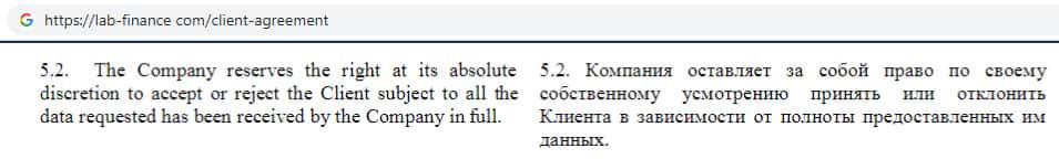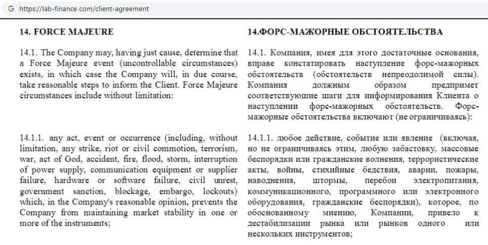 Ниже предоставлена полная версия клиентского соглашения жульнической организации Лаб Финанс, которое подтверждает то, что перед нами очередная форекс кухня.
