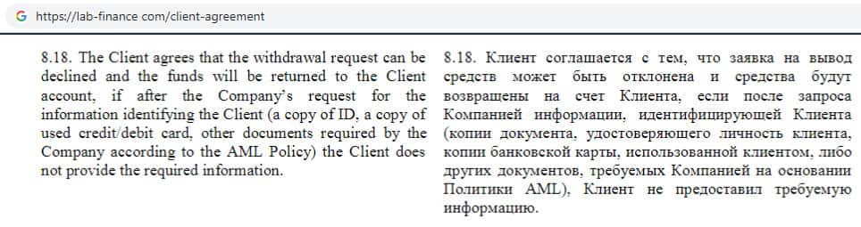 Псевдо-брокерская контора Lab Finance может в любой момент отклонить запрос на вывод денежных средств, если по их мнению какое-то из условий якобы не выполнено.