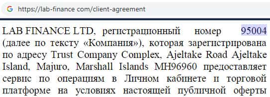 На своем официальном сайте мошенники Lab Finance предоставили регистрационный номер своей компании, который представлен на скриншоте ниже.