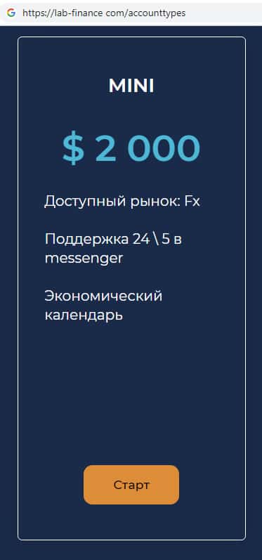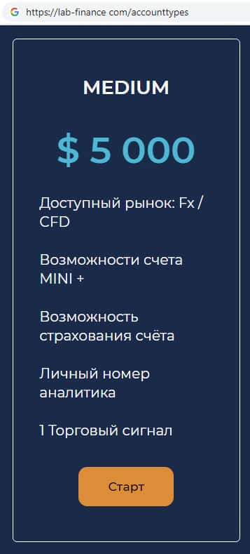 Мошенники Lab Finance предлагают клиентам на выбор 4 типа торгового счета: Mini, Medium, Premium, а также VIP. Реальный форекс стартует в основном с суммы в 100000 долларов.