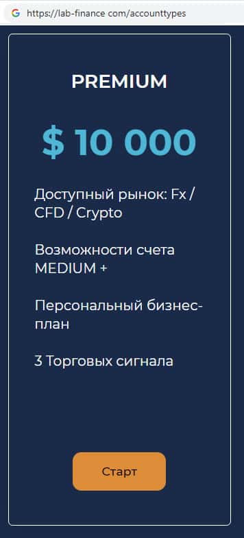 Так же аферисты Лаб Финанс предлагают тип торгового счета под названием Premium, где минимальный депозит составляет 10 тысяч долларов.