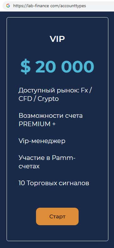 Аферисты Lab Finance рассказывают о торговом счете VIP, где минимальный депозит 20 тысяч долларов, что является очередным признаком лохотрона.