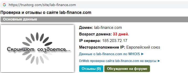 Проверка веб-сервиса псевдо-брокерской конторы Lab Finance на trustorg com показала, что возраст домена к моменту написания статьи составляет всего лишь 33 дня.