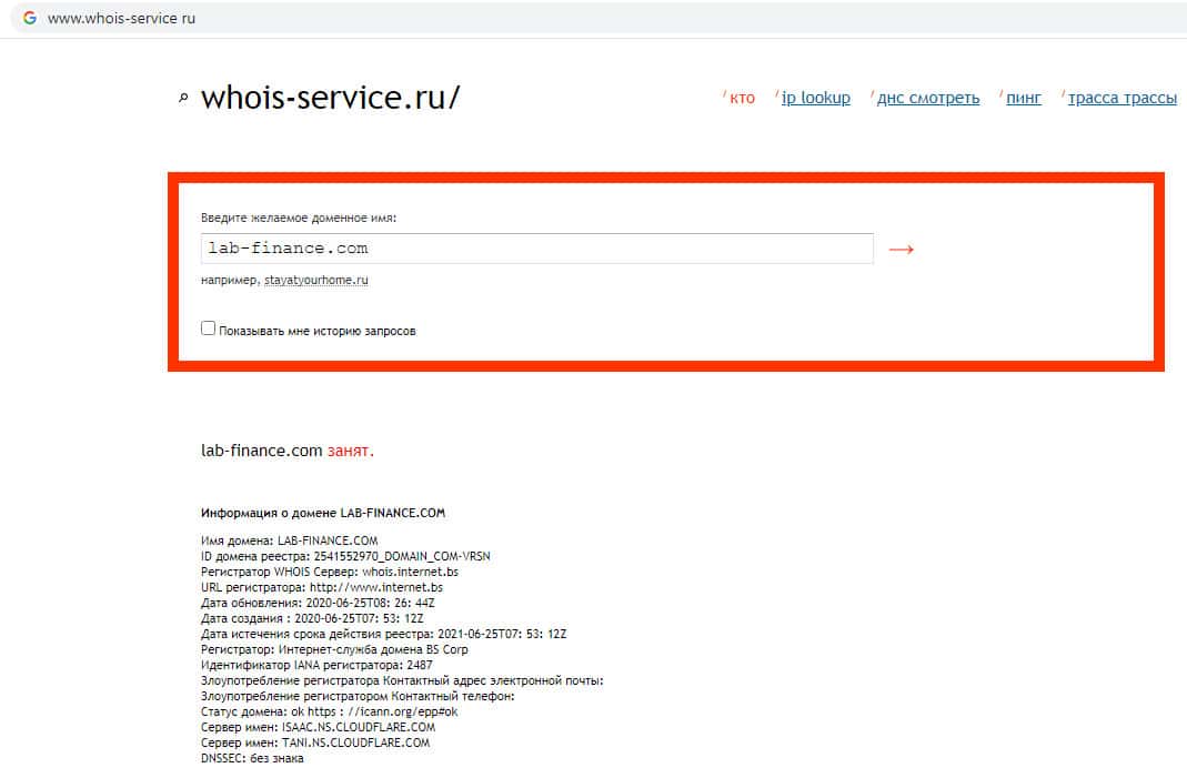 Проведя анализ данных по сайту lab-finance com, не было замечено информации о владельце домена, что является еще одним признаком того, что имеем дело с лохотроном.