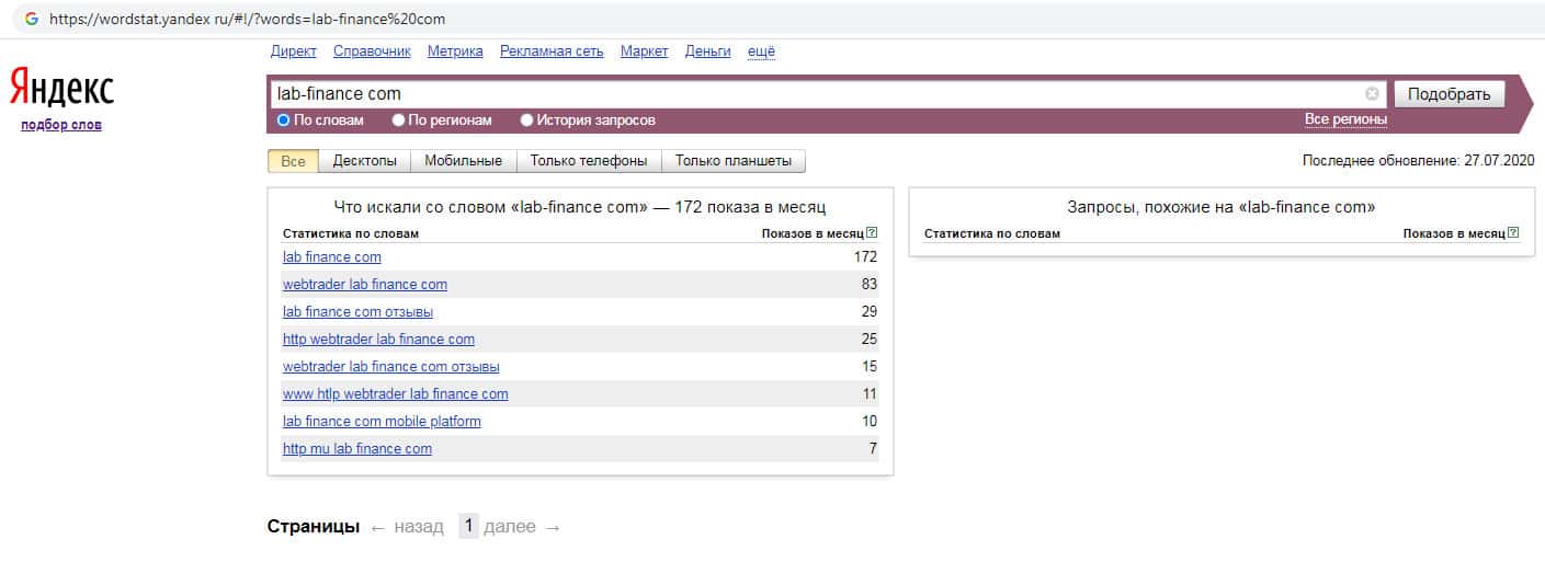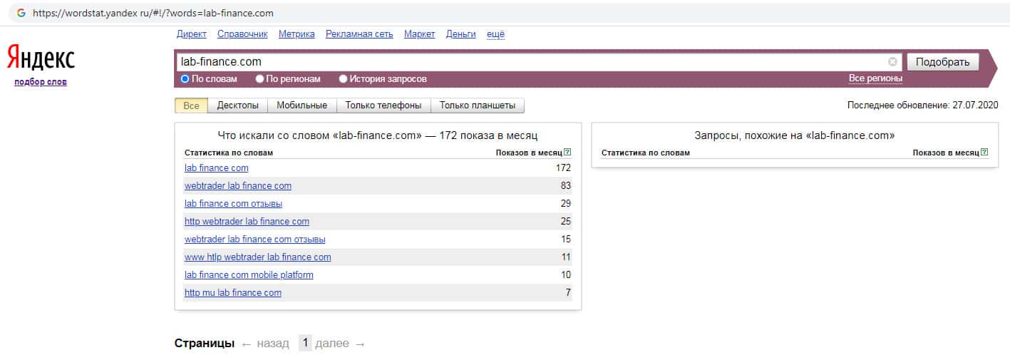 Количество запросов по бренду названия домена без точки "lab-finance com" на wordstat yandex ru составляет также 172 запроса за месяц.