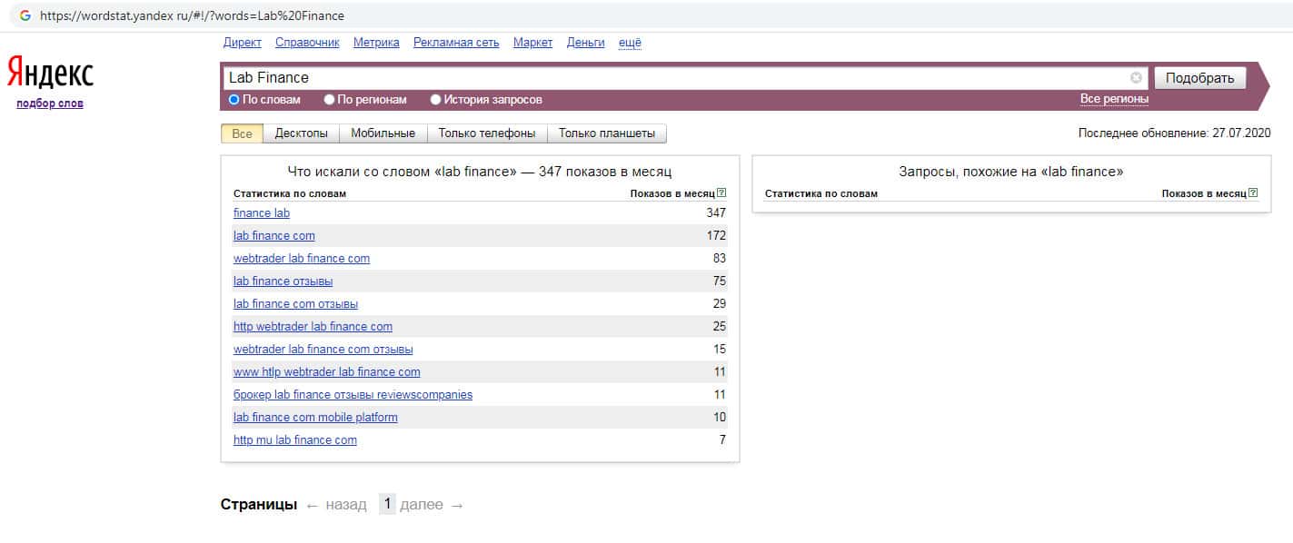 Количество брендовых запросов названия компании на русском языке без пробела "LabFinance" на wordstat yandex ru составило 12 показов за месяц.