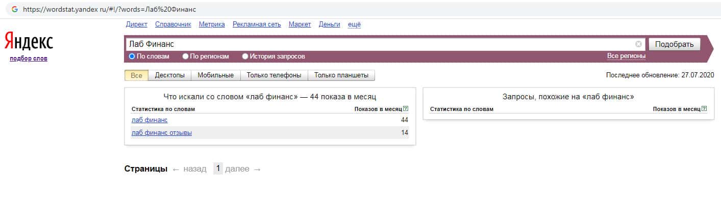 Количество запросов по бренду название компании на русском языке без пробела "ЛабФинанс" в поисковике Yandex составляет всего 2 запроса за месяц.