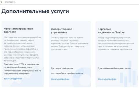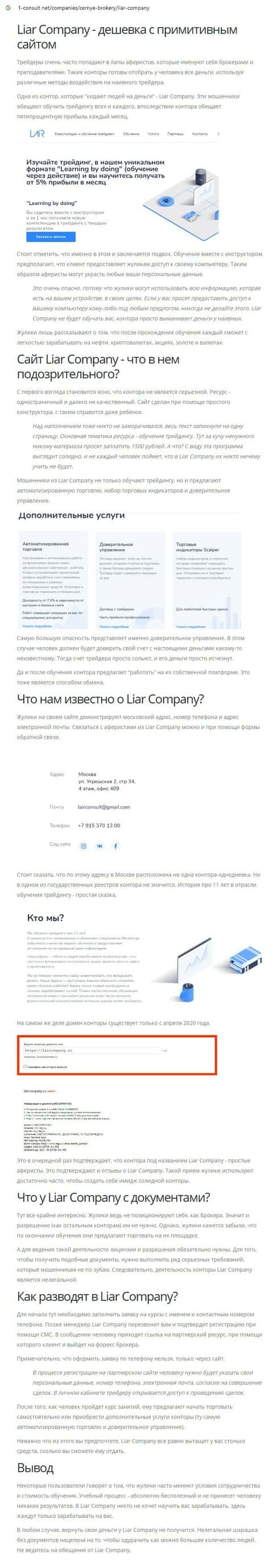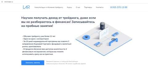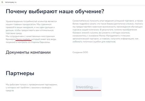 LairCompany Ru - очередной лоховодческий проект, который предлагает псевдо-обучение трейдингу и инвестированию, также шулера предлагают воспользоваться услугами доверительного управления, главная задача скам-конторы Lair: привести наивного клиента к брокеру-мошеннику из оффшора и получить за это свой процент, на сайте шараги указана информация о том, что партнерами данной мошеннической компании являются скам-организации SwissMarkets и Investing Com. Не советуем связываться с аферистами Лаир Компани !!!