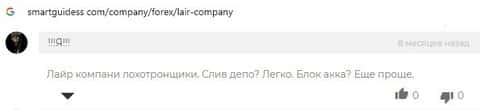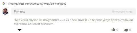 Далее предоставлен еще один отзыв одного из пользователей подтверждающий то, что обманщики Lair Company обещая доверительную торговлю сливают депозит клиента.