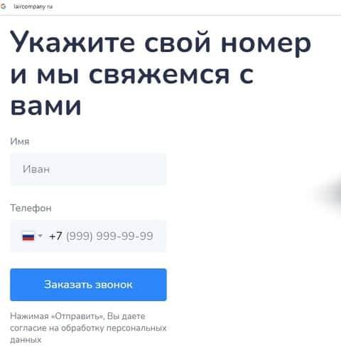 Лохотронщики Лаир Компани ведут сбор данных о посетителях своего дырявого сайта, просят указать свой номер контактного телефона в качестве обратной связи.