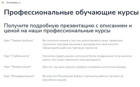 Аферисты Лаир Компани всячески втираются в доверие людям предлагая обучающие курсы о трейдинге и инвестировании, которые покупать бессмысленно.