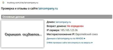 Проверка интернет-портала мошенников Лаир Компани на trustorg com показала, что возраст домена определить невозможно, мы имеем дело с очередной жульнической конторой.
