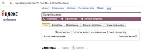 Количество запросов по бренду названия компании на русском языке "Лаир Компани" на Яндекс Вордстарт составило всего 1 запрос за месяц.