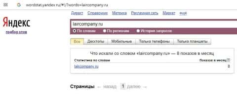 Количество запросов по бренду название домена компании "laircompany.ru" на wordstat yandex ru составляет 8 запросов за месяц.